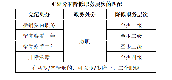 3.為準確區(qū)分責任輕重、體現懲戒效果,也可考慮同時給予黨紀、政務輕處分。給予黨內警告處分的,可以與政務警告或者政務記過處分匹配適用;給予黨內嚴重警告處分的,可以與政務記大過或者降級處分處分匹配適用。