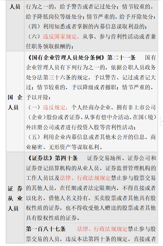 2.禁止情形和負面清單主要包括七類行為、四類對象。“違反有關規(guī)定從事營利活動”意味著《紀律處分條例》和《政務處分法》本身并未對禁止事項和行為作出詳細規(guī)定,需要援引相關黨規(guī)國法的規(guī)定。根據(jù)《證券法》和《關于黨政機關工作人員個人證券投資行為若干規(guī)定》的規(guī)定,